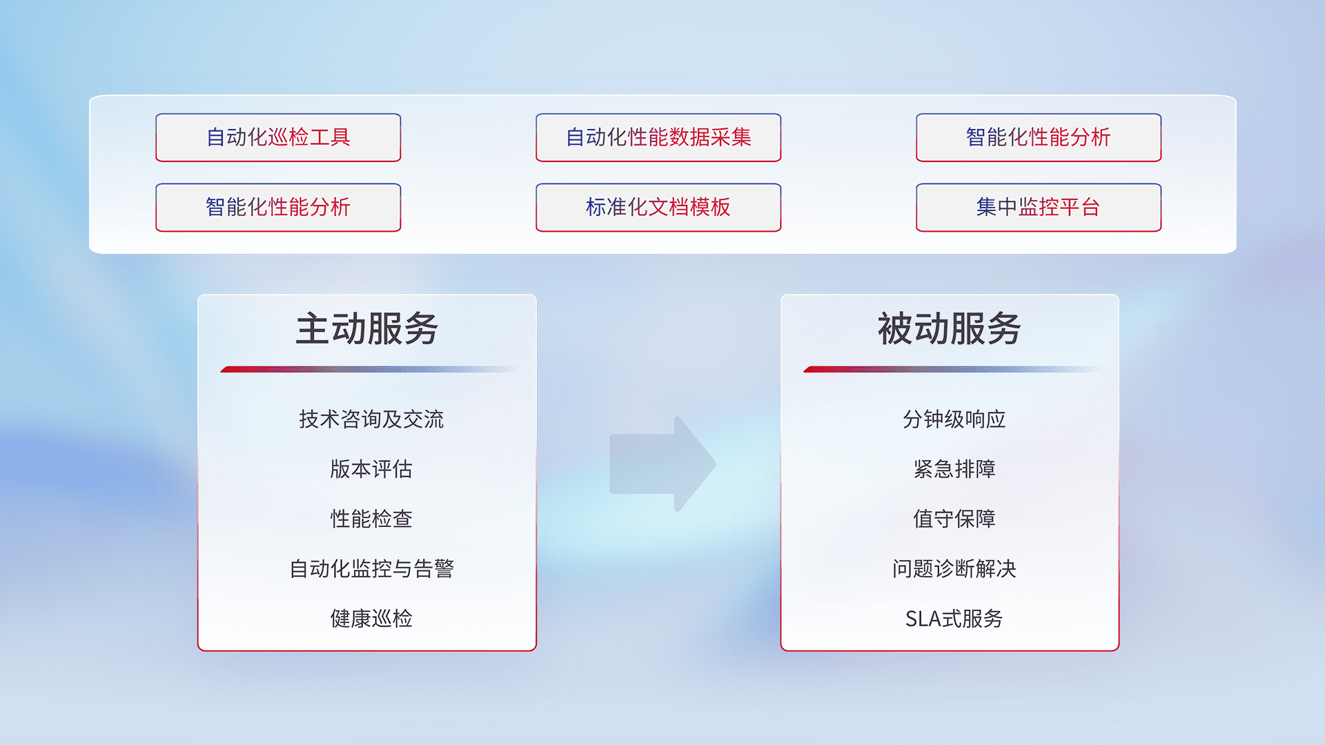 智能化工具和标准化文档,,,保障服务质量,,提供主动服务(包含技术咨询、、版本评估、、性能检查、、、自动化监控与告警、、、、健康巡检)和被动服务包含(分钟级响应、、、、紧急排障、、、、值守保障、、问题诊断解决、、、SLA服务)。。。